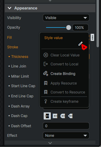 | Steps To Reproduce | Repro Steps: 1) Create a Page 3) Navigate to the Add Assets panel (Ctrl+2), and add a Path Element to the Stage. 4) Select the Path, and in the Properties Panel, make some changes to its Properties to modify them from the default. 5) Right-Click on the Path with the modified Property values, navigate to 'Make Into' then select 'Style'. 6) Exit the Style Editor, to return to the Page featuring the Path that now has the Style applied to it. 7) Select the Path, navigate to its Properties Panel, and find any Properties that have values inherited from the Style. These will be visible as being outlined in orange. 8) Once a Property has been found that gets its values from the Style, hover over the Property, and click on its 3-Dot menu that is revealed on hover. 9) Click on the Pencil (Edit) icon that appears in the Property's context menu. (See attached screenshot for reference) Observe how no action results from clicking on the icon. Expected Results: From other instances in the application where this Pencil/Edit icon appears, this should in theory, take the user to the Style where they can edit this value within. | ||||