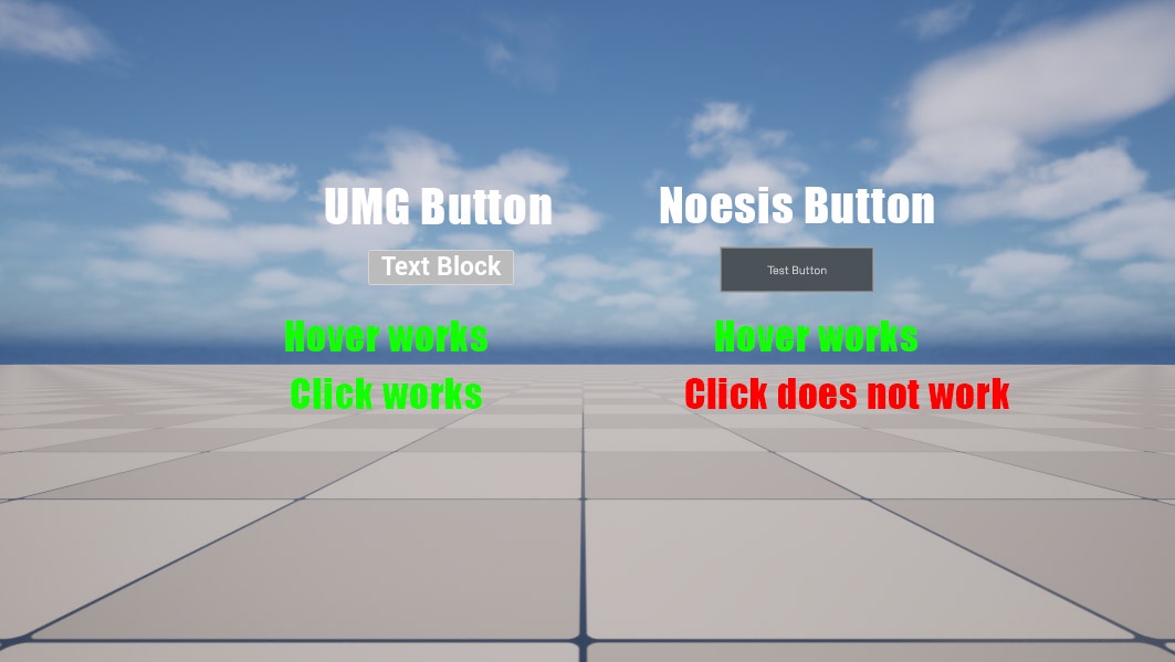 | Description | Hi there, I'm having an issue with Unreal Engine 5.5.3 (latest) and Noesis 3.2.7 (latest). My problem is that according to the docs, Noesis views (widgets) should work fine with widget components (UWidgetComponent), however, if I try to place a Noesis view inside a widget component in the world, the contained UI does not receive mouse click events. (hover works fine though) It seems to give back focus to the game viewport. The widget component mode is set to screen space, so it's always an overlay of the world, not really what Noesis World UI implement. I've tested the issue with a fresh empty UE project to make sure it's not my project settings are causing the issue. I parallel tested with regular UMG widgets, and they do work fine in the very same situation. | ||||