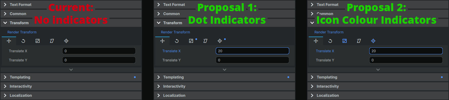 | Description | Some time ago, we made an absolutely massive quality-of-life improvement where we added Blue (and/oror Orange) indicator dots to the Properties Panel as a method to express that 'a value has been changed within this section'. When dealing with the various Transform modes we offer, our current system helps you wayfind changed values to the point where you can determine whether the changed value was a Render Transform, a Layout Transform, or a 3D Transform value. However, the only way to determine which specific Property has been changed within each, is to systematically peck-and-click on every Render/Layout/3D Transform tab until the blue-coded value can be identified. See attached video showcasing the process of finding where there Blue Label for the Render Transform Group is coming from. See attached image of potential proposals to resolve this. I would likely say that the Dot method is a better fit, due to us typically using dots for 'There is a change inside of this' (rather than Blueing the icon akin to how we Blue our Properties themselves) | ||||