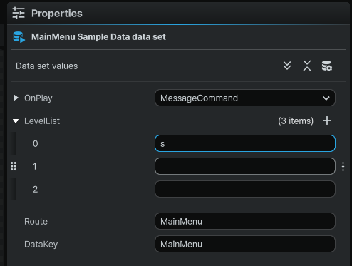 <Class Name="MainMenuViewModel" Base="MyGame.MainMenuViewModel"> <Property Name="OnPlay" Type="Command"/> <Property Name="LevelList" Type="Collection" SubType="String" CollectionMinItemCount="0" CollectionMaxItemCount="10"/> </Class> MainMenu Sample Data.xaml (352 bytes)